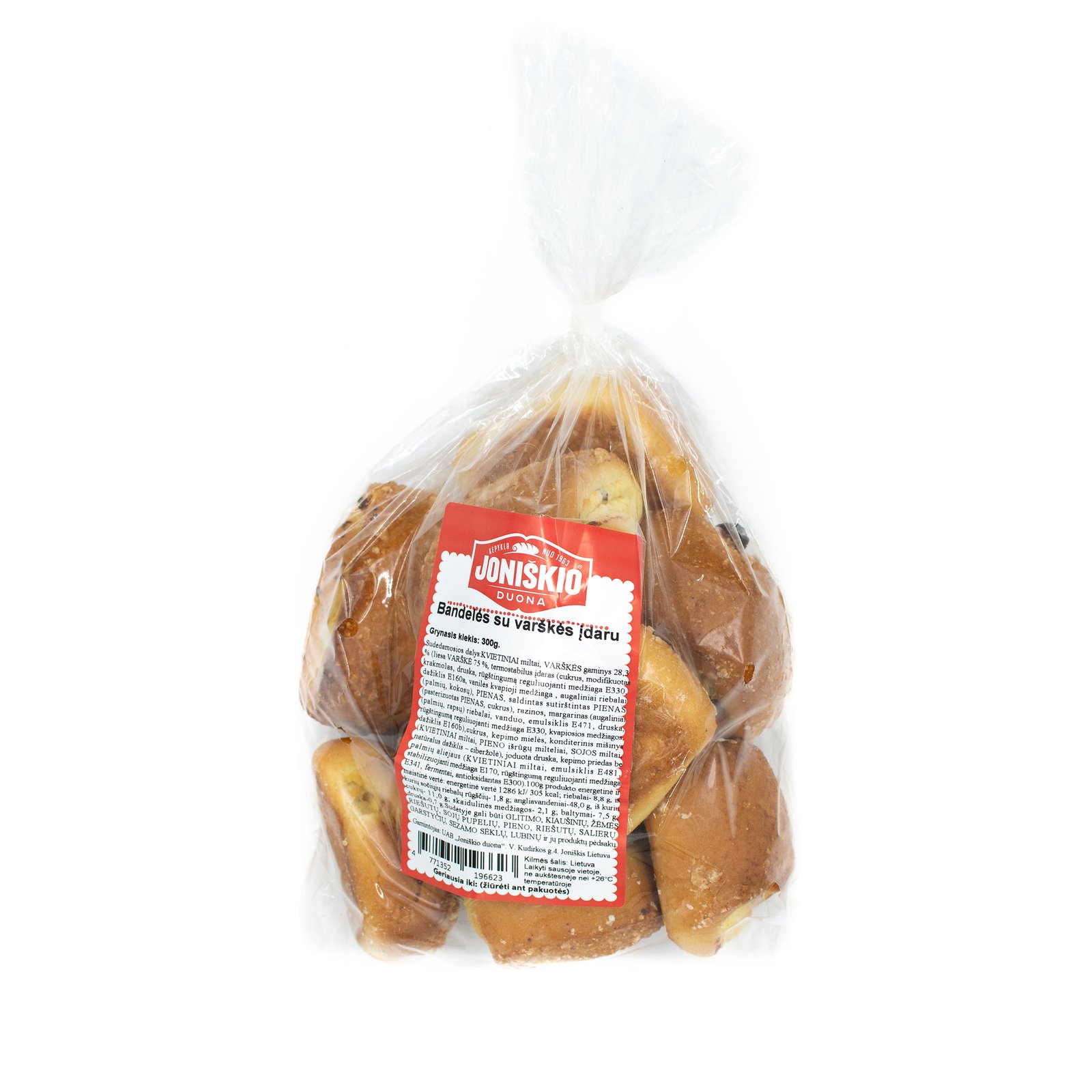 KVIETINIAI miltai, VARŠKĖS gaminys 28,3% (liesa VARŠKĖ 75%, termostabilus įdaras (cukrus, modifikuotas krakmolas, druska, rūgštingumą reguliuojanti medžiaga E330, dažiklis E160a, vanilės kvapioji medžiaga, augaliniai riebalai (palmių, kokosų), PIENAS, cukrus), razinos, margarinas (augaliniai palmių, rapsų) riebalai, vanduo, emulsiklis E471, druska, rūgštingumą reguliuojanti medžiaga E330, kvapiosios medžiagos, dažiklis E160b), cukrus, kepimo mielės, konditerinis mišinys (KVIETINIAI miltai, PIENO išrūgų milteliai, SOJOS miltai, natūralus dažiklis -ciberžolė), joduota druska, kepimo priedas be palmių aliejaus (KVIETINIAI miltai, emulsiklis E481, stabilizuojanti medžiaga E170, rūgštingumą reguliuojanti medžiaga E341, fermentai, antioksidantas E300)
