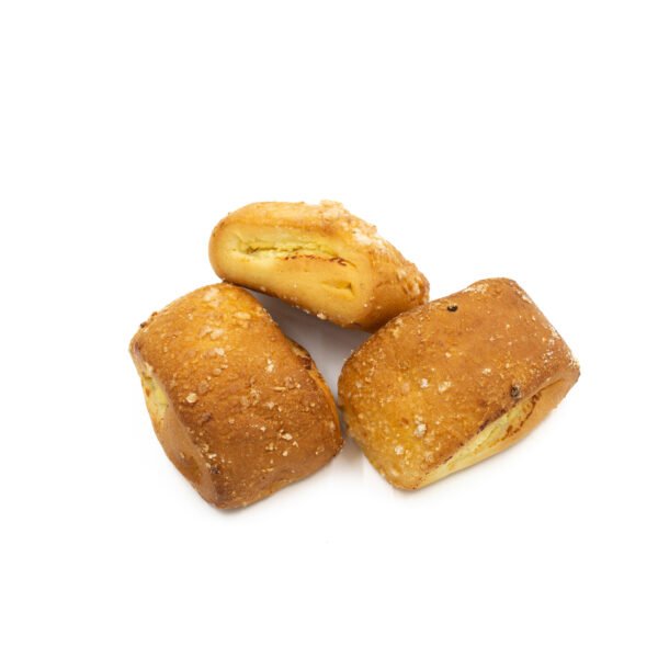 Auksinė plutelė slepia baltą, švelnų varškės įdarą su razinų natomis. Kiekvienas kąsnis minkštas, purus ir saldžiai nostalgiškas. Šiluma ir paprastumas susijungia į skonį, kuris primena vaikystės kepinius.
