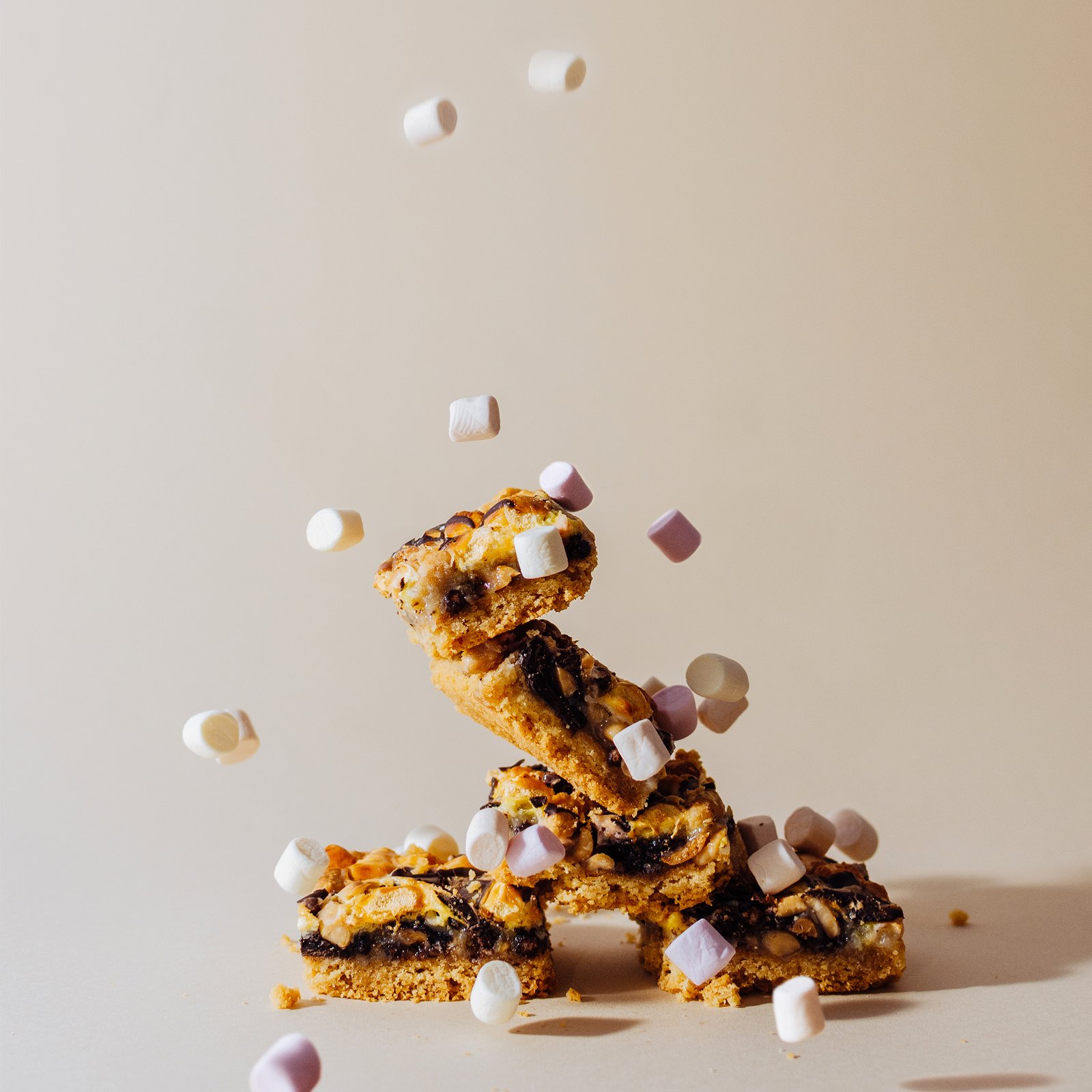 Sausainiai (KVIETINIAI miltai, cukrus, palmių riebalai, vanduo, gliukozės-fruktozės sirupas, joduota druska, emulsiklis SOJOS lecitinas, tešlos kildymo medžiagos: dinatrio difosfatas, natrio bikarbonatas, amonio bikarbonatas, kvapioji medžiaga), saldintas sutirštintas PIENAS (nenugriebtas PIENAS, cukrus), zefyrai 12% (gliukozės sirupas, sausi KIAUŠINIŲ baltymai, tirštiklis agaras, stabilizatorius lecitinas, kvapioji medžiaga, cukraus pudra, maistinės KVIEČIŲ skaidulos), SVIESTAS, kepinti, sūdyti ŽEMĖS RIEŠUTAI, juodo šokolado lašai (kakavos masė 49,71%), pūsti KVIEČIAI.