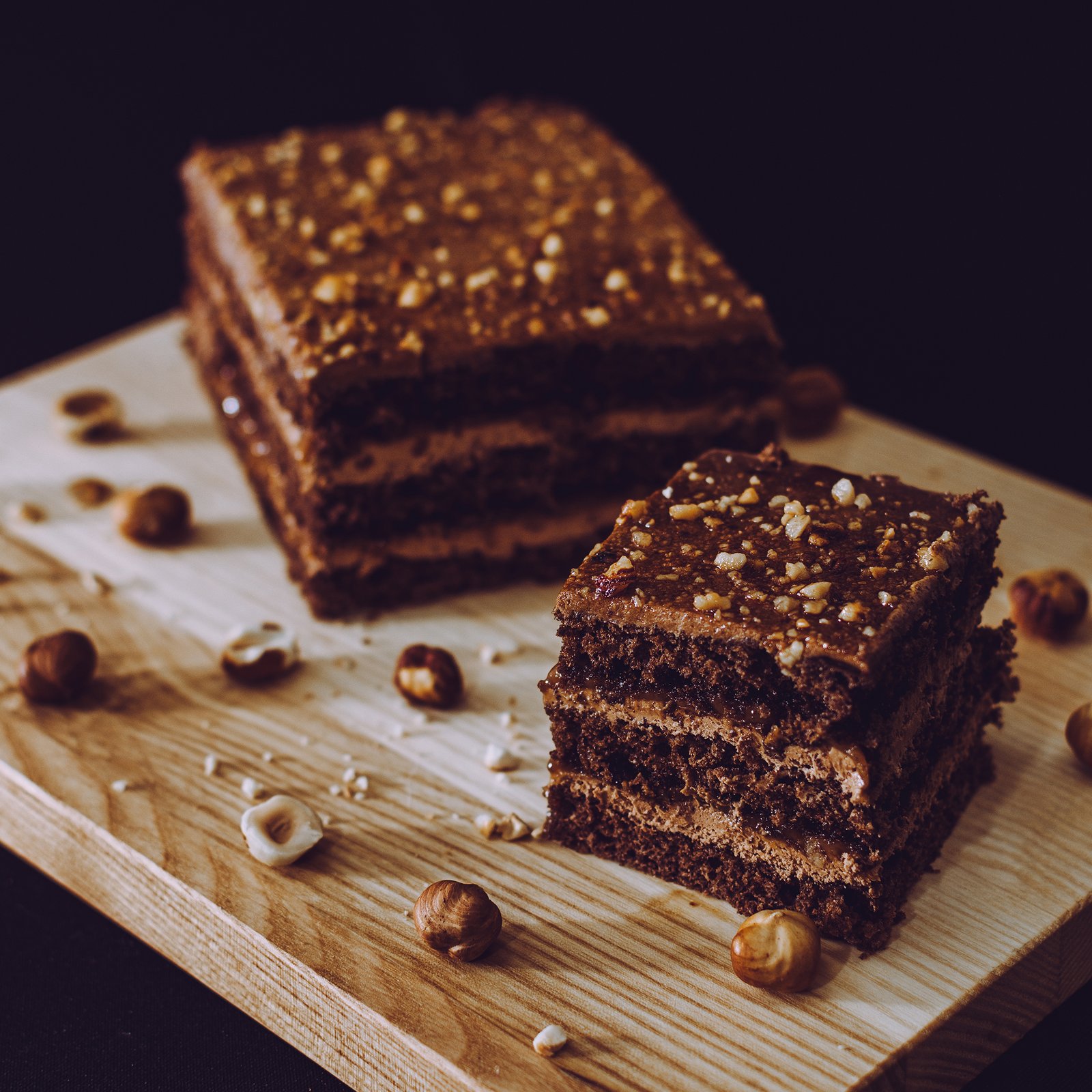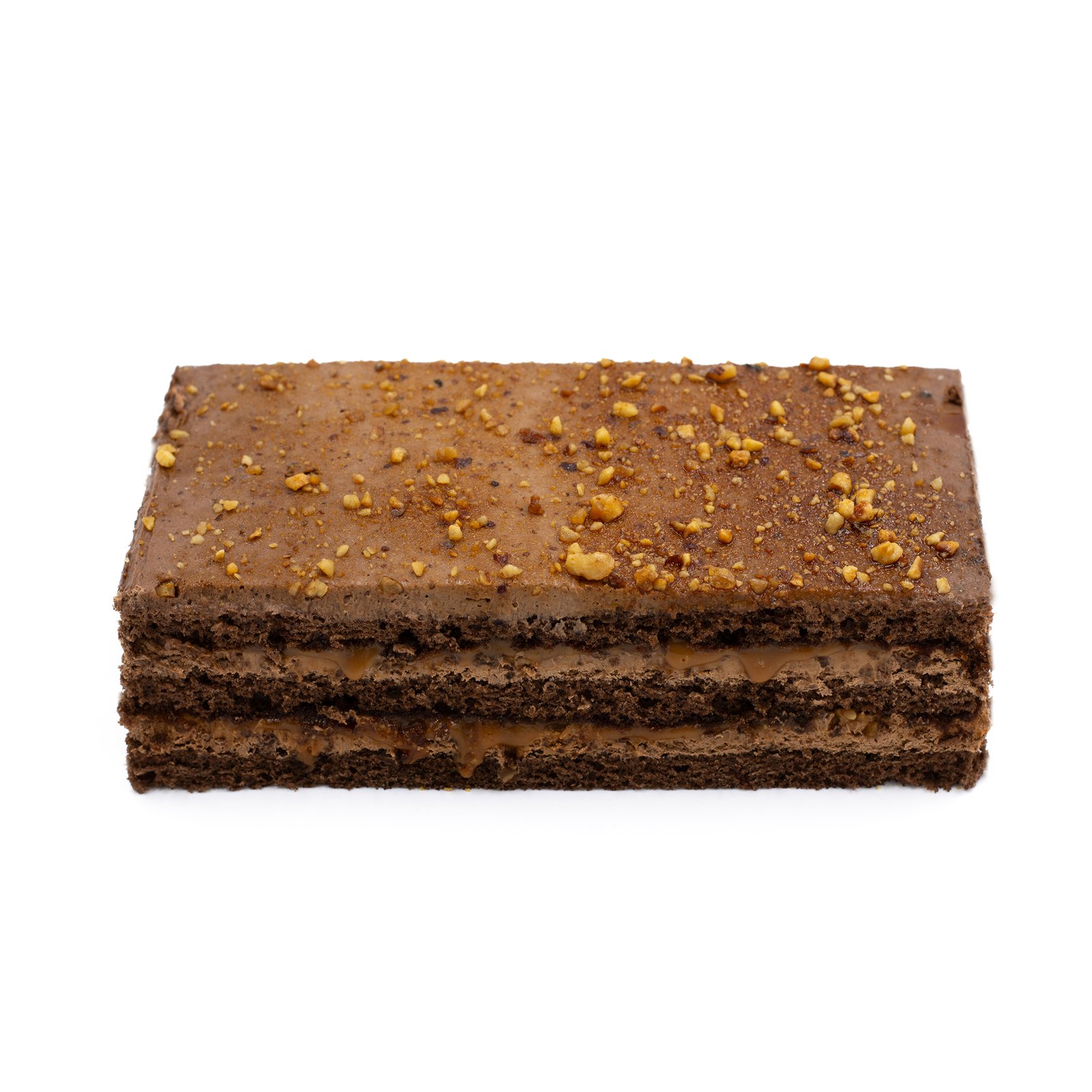 Plokštainis GRILIAŽAS – tamsiai rudos spalvos, sluoksniuotas pyragas su šokoladiniu kremu ir riešutų trupiniais viršuje. Jame susilieja kakavos sodrumas, riešutų skrudintumas ir grietinėlės švelnumas. Kiekvienas kąsnis – subtilus saldumo ir karamelinio poskonio derinys, kuris palieka jaukų įspūdį.