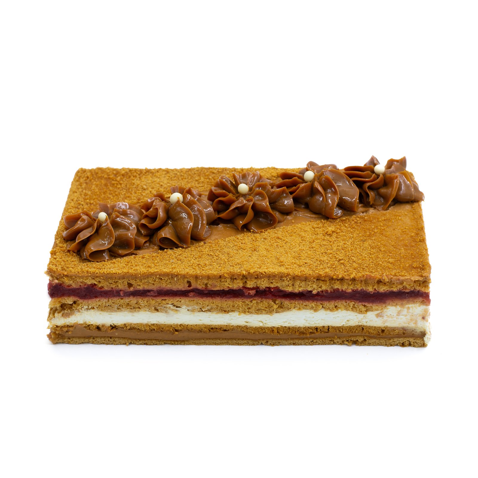 KVIETINIAI miltai, braškės 19,5%, karamelizuotas saldintas sutirštintas PIENAS (PIENAS, cukrus), tepamasis sūris 23% riebumo (šviežias sūris, PIENO baltymai), KIAUŠINIŲ masė, sausa karamelė ( cukrus), medus, SVIESTAS nuaze (SVIESTAS), SVIESTAS 82%, saldintas plakamasis kremas (vanduo, visiškai hidrinti palmių branduolių riebalai RSPO MB(25%), cukrus, PIENO baltymai, emulsikliai: E472b, E322 ( SOJŲ), E472E, stabilizatoriai: E460, E466, E340, kvapioji medžiaga, dažiklis E160a), cukrus, grietinė 30% (PIENAS, GRIETINĖLĖ, raugas), miltelinis cukrus, tešlos kildymo medžiaga E500, vaisių pektinas (tirštiklis E400, stabilizatorius E450, dekstrozė, antioksidantas E341), citrinų rūgštis, želatina.