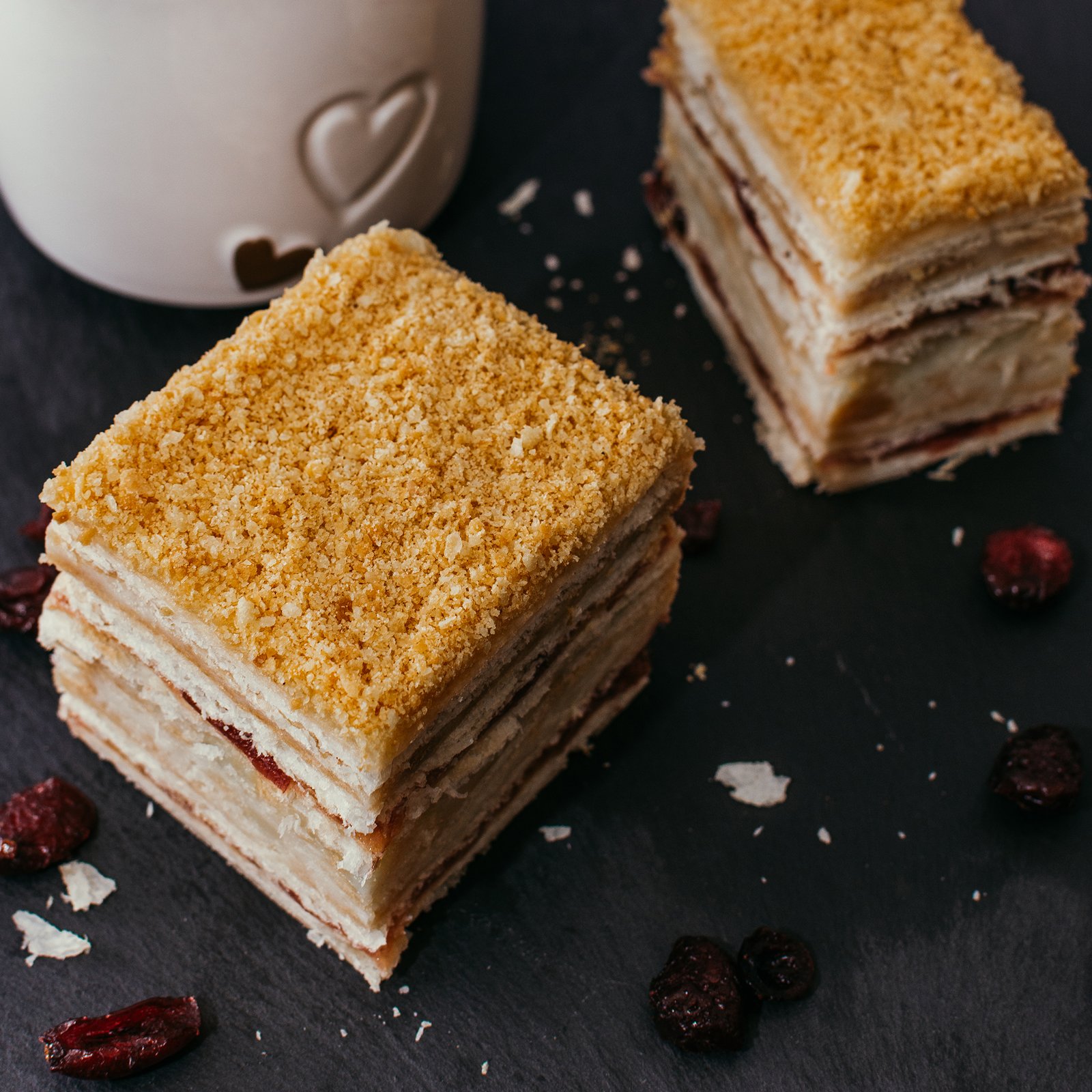 Švelnūs pyrago sluoksniai paslepia baltą kremo purumą ir sodrų spanguolių atspalvį. Kiekvienas kąsnis balansuoja tarp saldumo ir rūgštelės. Lengvas aromatas ir tirpstanti tekstūra kuria tikrą naminio jaukumo pojūtį.