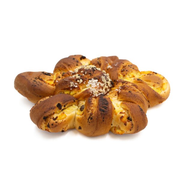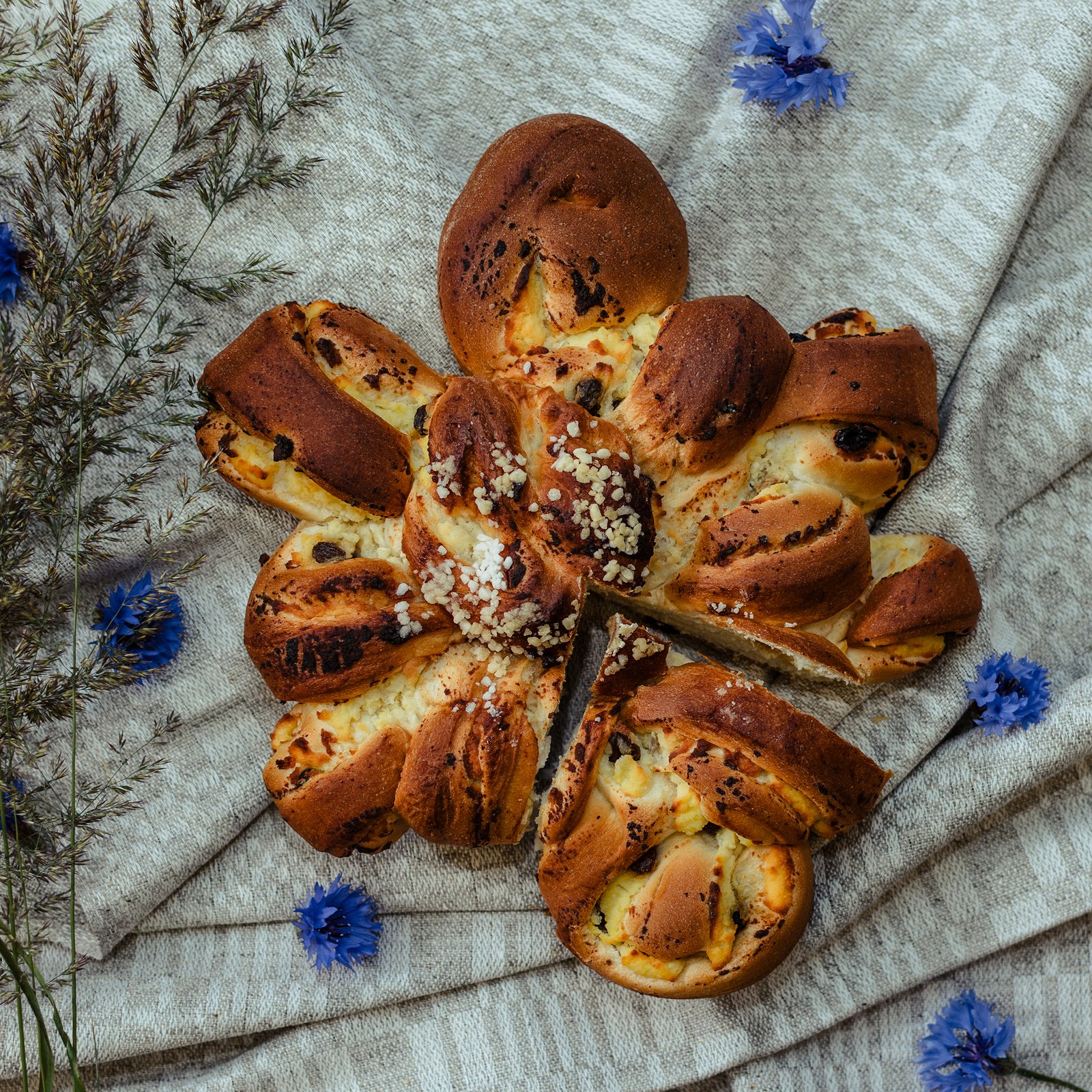 Auksinis paviršius slepia baltą varškės įdarą su razinų taškeliais. Kiekvienas kąsnis – purus, saldus ir švelniai kreminis. Skonis, kuris apkabina šiluma ir primena namus.