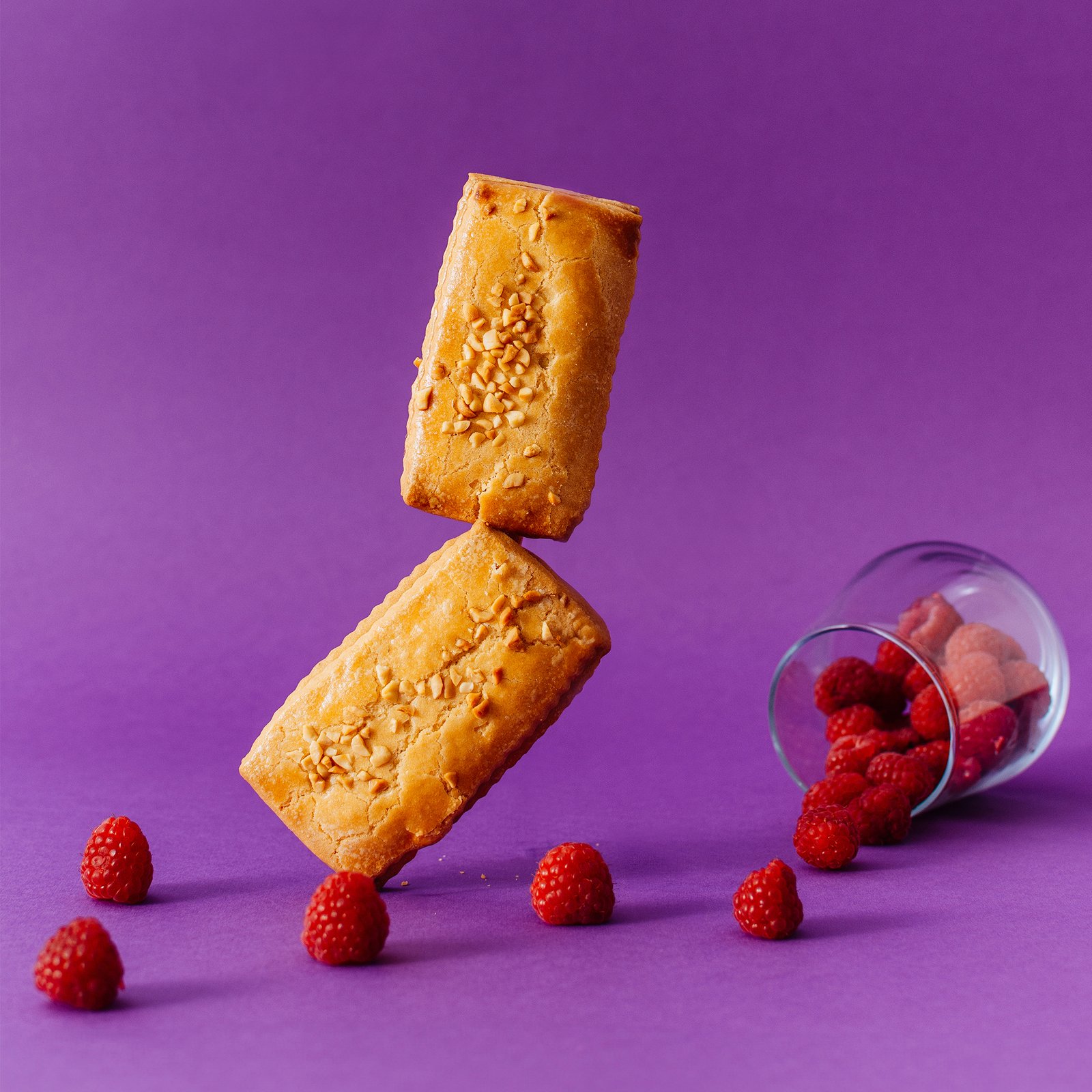 Auksinė juostelė trapios tešlos, paslėpusi aviečių raudonį ir riešutų trupinius. Kiekvienas kąsnis sujungia lengvą traškesį su vaisių gaiva. Švelnus saldumo ir rūgštelės žaismas palieka malonų, užburiantį poskonį.